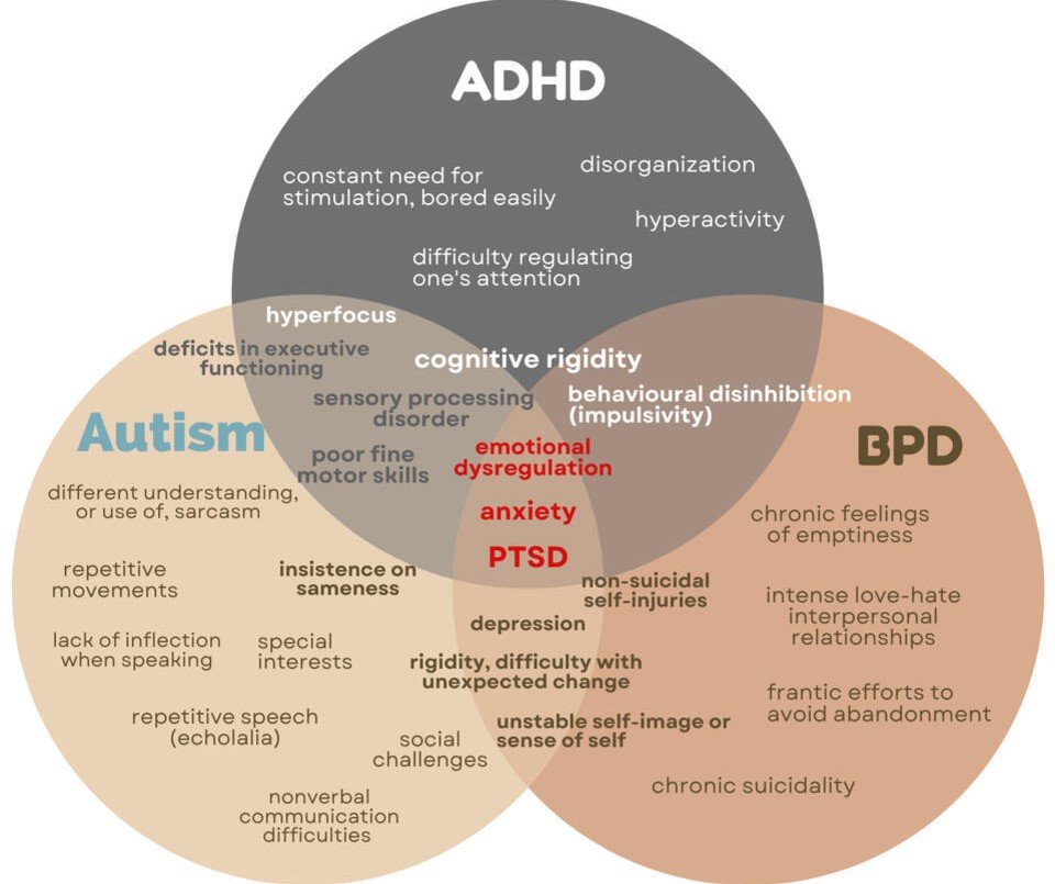 - The symptoms of BPD and neurodivergent conditions can overlap, leading to misdiagnosis or delayed diagnosis. For example, emotional dysregulation in ADHD may be mistaken for BPD, or social difficulties in autism may be misinterpreted as BPD-related relationship instability.